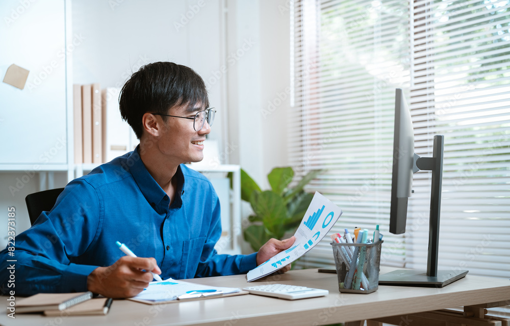 office, project, designer, job, learning, freelancer, manager, concentration, occupation, working. A man is sitting at a desk with a computer monitor and a stack of papers. He is smiling and happy.