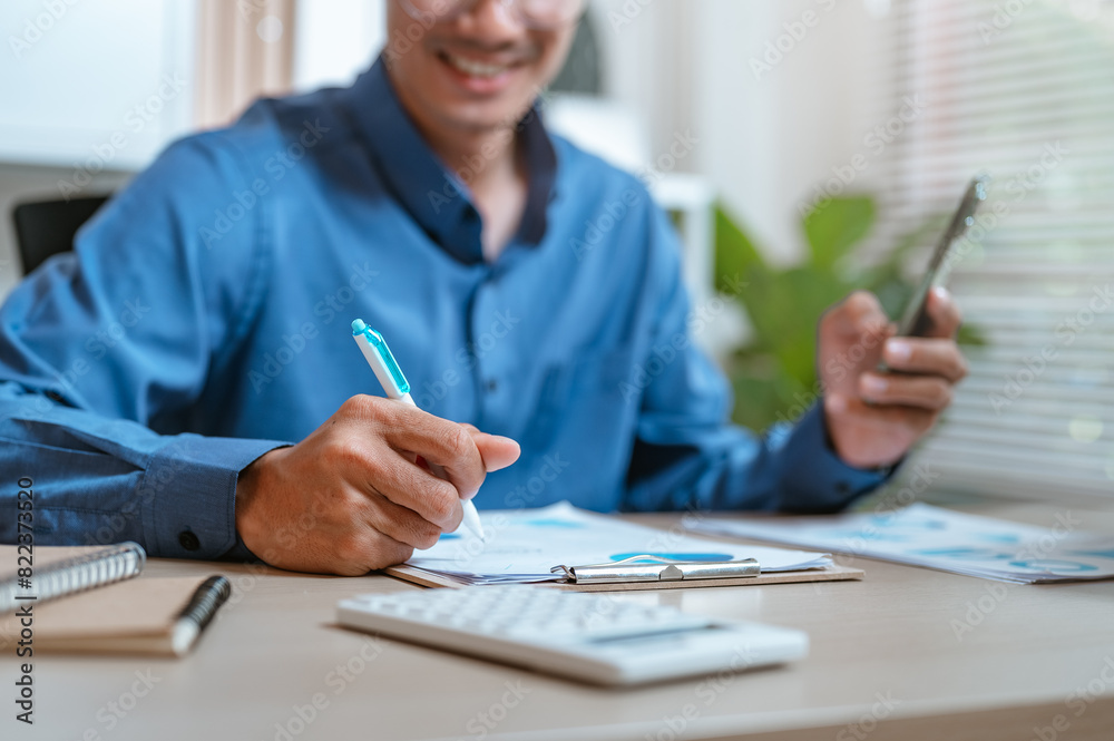 calculating, document, executive, manager, occupation, paperwork, financial, planning, working, reading. A man is sitting with a cell phone in his hand. He is writing with pen and focused on his work.
