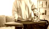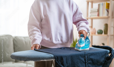 housekeeping, hygiene, laundry, garment, shirt, steam, housework, cleaning, domestic, housewife. A woman is ironing a blue shirt on an ironing board. The iron is hot and she is holding it.