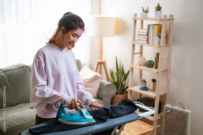 maid, studio, housekeeping, hygiene, laundry, lifestyle, domestic, housewife, housework, style. A woman is ironing clothes in a living room. The room is well-lit and has a cozy atmosphere.