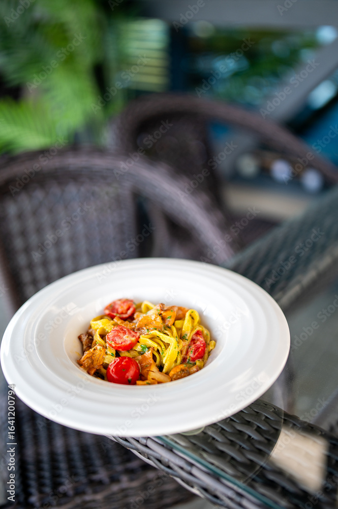housekeeping, hygiene, laundry, domestic, garment, housewife, housework, maid, steam, clothes. A woman is ironing a shirt on an ironing board. The iron is hot and she is holding it with both hands.