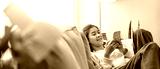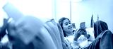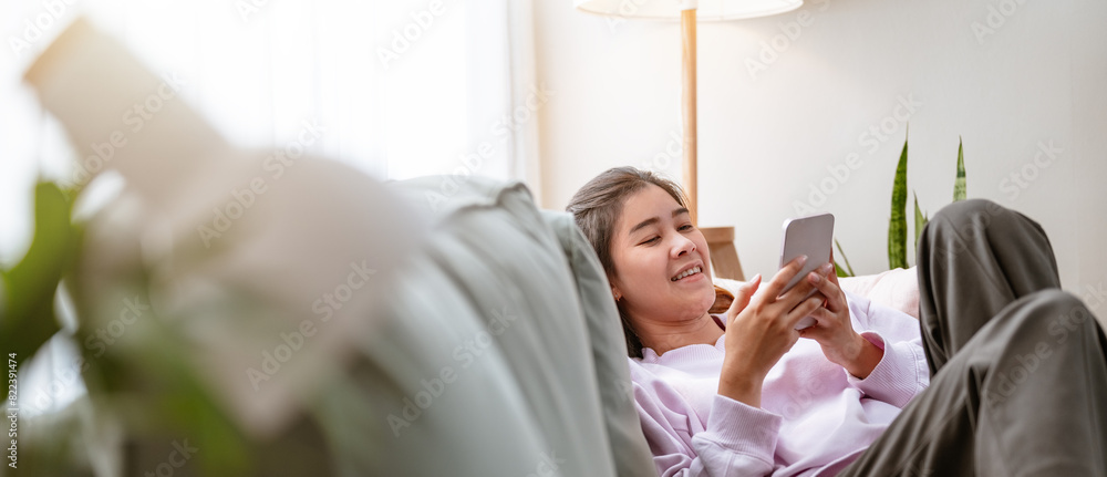 communication, looking, sofa, watching, happy, couch, relax, reading, social, comfortable. A woman is laying on a couch and looking at her cell phone. She is smiling and she is enjoying herself.