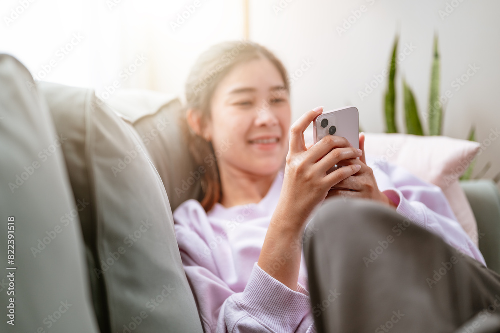 sofa, mobile, couch, relax, communication, chat, smartphone, living, youth, social. A woman is laying on a couch and looking at her cell phone. She is smiling and she is enjoying herself.