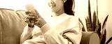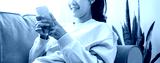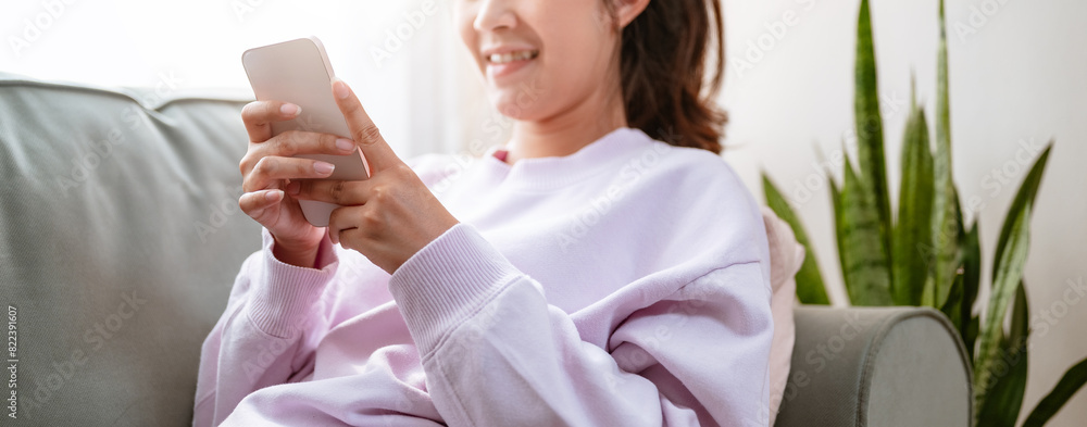 smartphone, game, communication, living, sofa, chat, relax, pointing, social, message. A woman is sitting on a couch and smiling while holding smartphone. as the woman is enjoying her time.