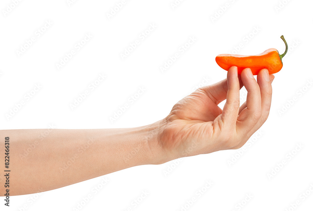 orange mini bell pepper in hand path isolated on white