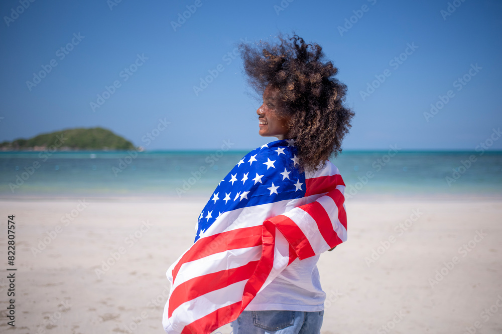 Happy younger woman relaxed summer holiday or patriotic holiday on the beach hand holding with American flag meaning USA celebrate 4th of July. Independence Day concept.