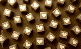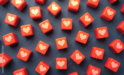 Hearts on scattered blocks. Likes on social media. Love and relationships. Choosing your favorites.