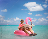 Mature man sitting on a flamingo swimming ring and reading a newspaper