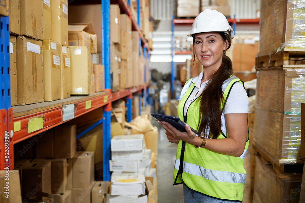 portrait worker working on tablet and looking at cardboard box on shelf in warehouse storage