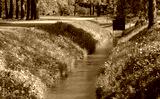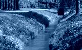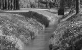 Kanał melioracyjny wśród wiosennej zieleni miejskiej. Piękna zieleń miasta w szczytowym okresie rozwoju wczesnowiosennego.