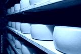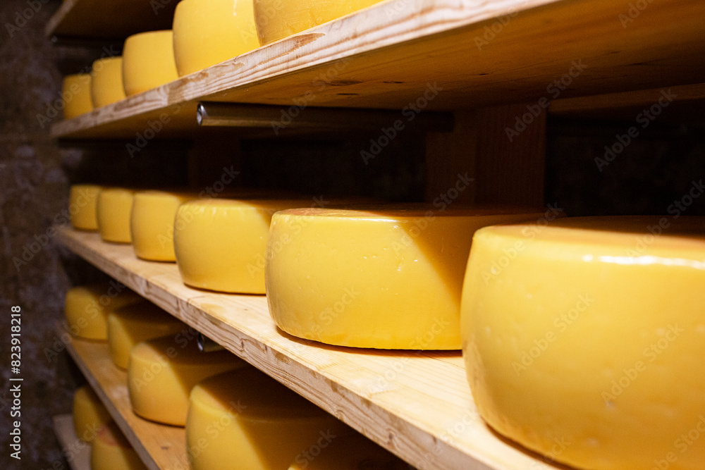 Dutch artisanal cheeses close up, maturing on wooden shelves