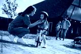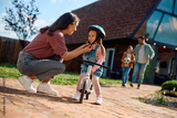 Happy mother assisting her small daughter in riding bicycle outdoors.