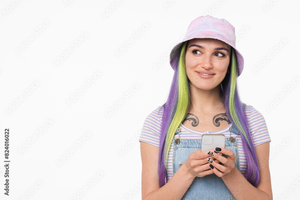 Pensive thoughtful curious caucasian young teenage girl hipster woman thinking about buying new house, cashback, e-banking, using smart phone online isolated in white background