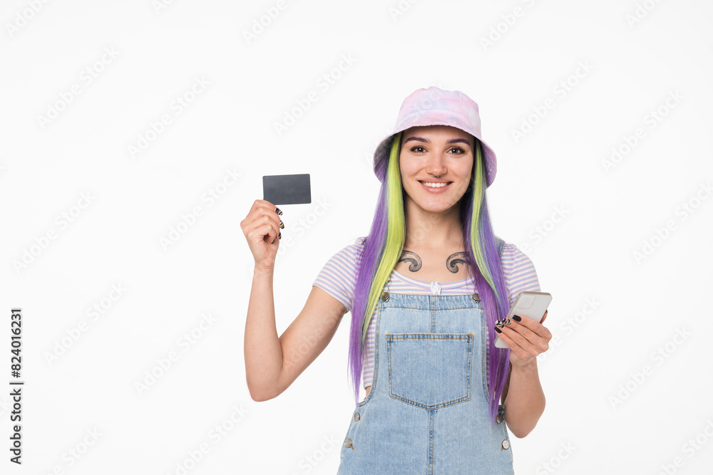 Young caucasian hipster teenage woman girl with tattoo holding credit card for internet banking, e-commerce, online transactions, cashback, payments isolated in white background
