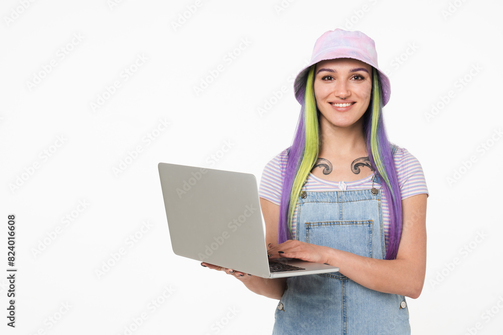 Modern young teenage caucasian woman girl hipster using laptop online looking at camera for remote work, e-learning, e-banking, surfing social media isolated in white background
