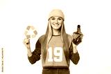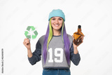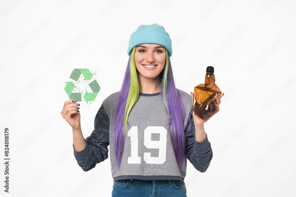 Happy caucasian eco-activist volunteer eco-friendly woman holding recycling sign logo against plastic pollution and plastic bottle, zero waste concept isolated in white background