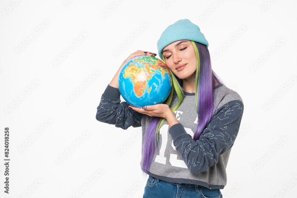 Cheerful caucasian eco-friendly young woman hipster embracing hugging globe, protecting against coronavirus pandemic pollution contamination isolated in white