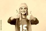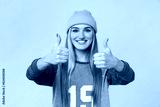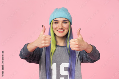 Closeup cropped portrait of positive teenage girl woman hipster with dyed colorful hair smiling with toothy smile showing thumbs up likes isolated in pink background