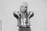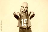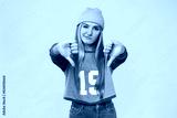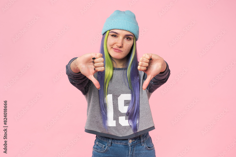 Disappointed sad angry offended caucasian young teenage woman girl hipster showing thumbs down dislike isolated in pink background