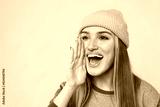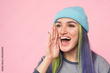 Smiling caucasian young woman teenage hipster girl using her palm as a loudspeaker telling secrets rumors news about sale offer discount isolated in pink background