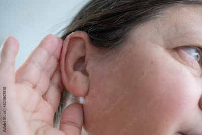 caucasian mature woman difficulty hearing, cerumen impaction, hearing loss, medical concept, loud sounds, middle ear inflammation, ototoxic medicines