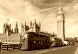 Houses of Parliament with Big Ben and double-decker buses on Westminster bridge, London, UK