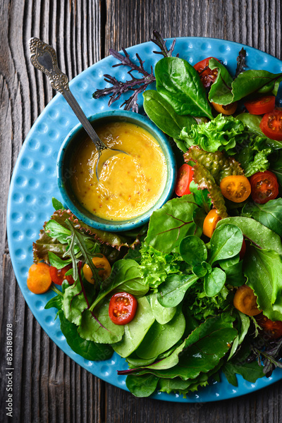 Mix of fresh juicy salad greens and cherry tomato with honey mustard salad dressing in blue plate on rustic wooden table. Food photography