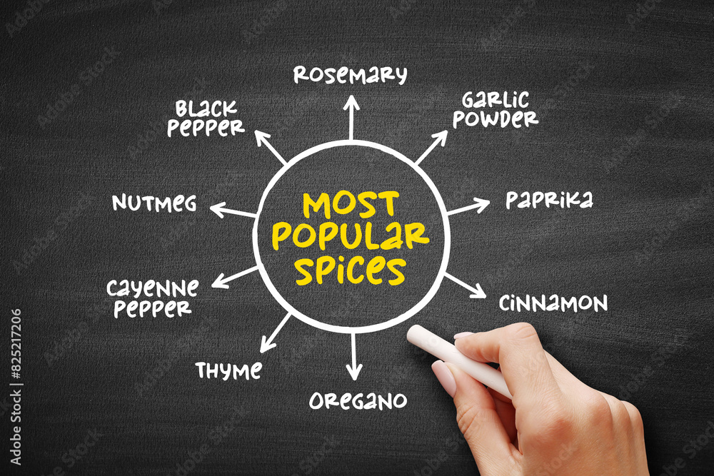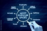 Most popular spices (seed, fruit, root, bark, or other plant substance primarily used for flavoring or coloring food) mind map text concept background