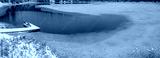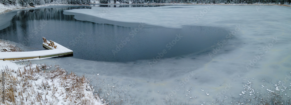 Panoramic view of a small lake with a fishing dock as the water in the lake is freezing into ice. An area of open water still exists in front of the dock.