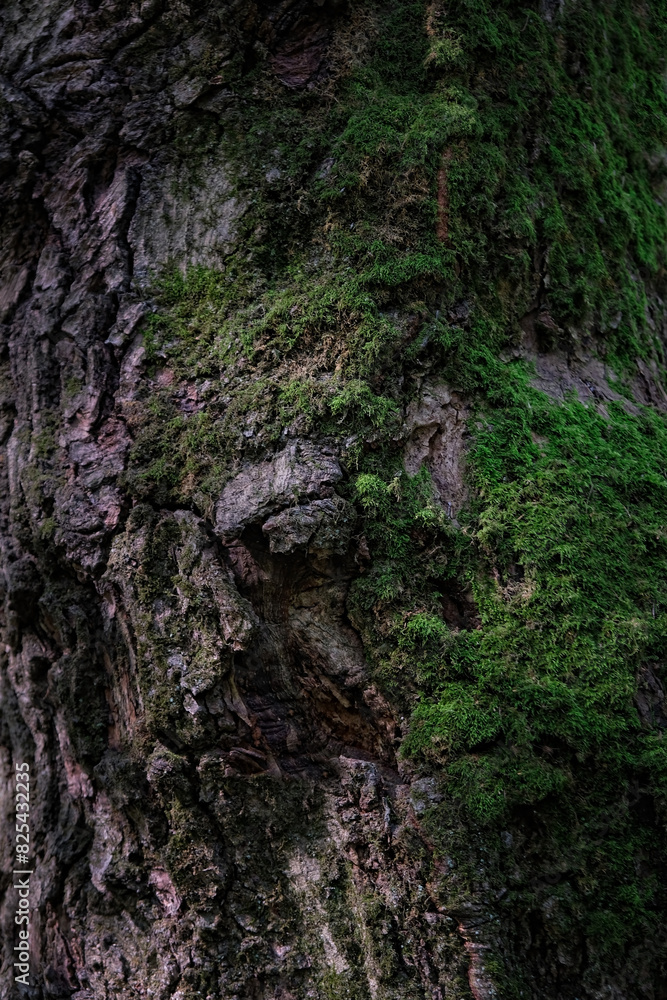tree bark texture with moss, dark abstract natural background close up. tree surface full frame macro shot. template for design