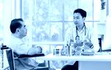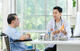 Asian smart man, orthopedic doctor consulting elderly patient with leg injury explaining treatment methods of trauma using anatomical model foot. Treatment of embitterment, fracture of leg in hospital
