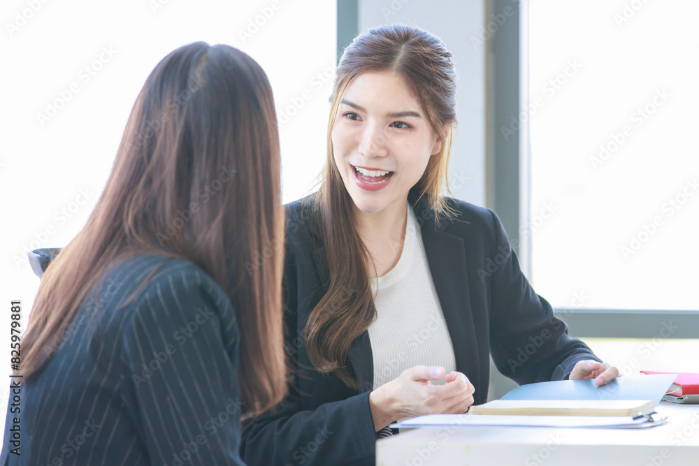 Asian two young business woman in suit sit at desk discuss project details, diverse female colleagues meet in office, share opinion, working on collaborative task, Commercial offer to company clients.