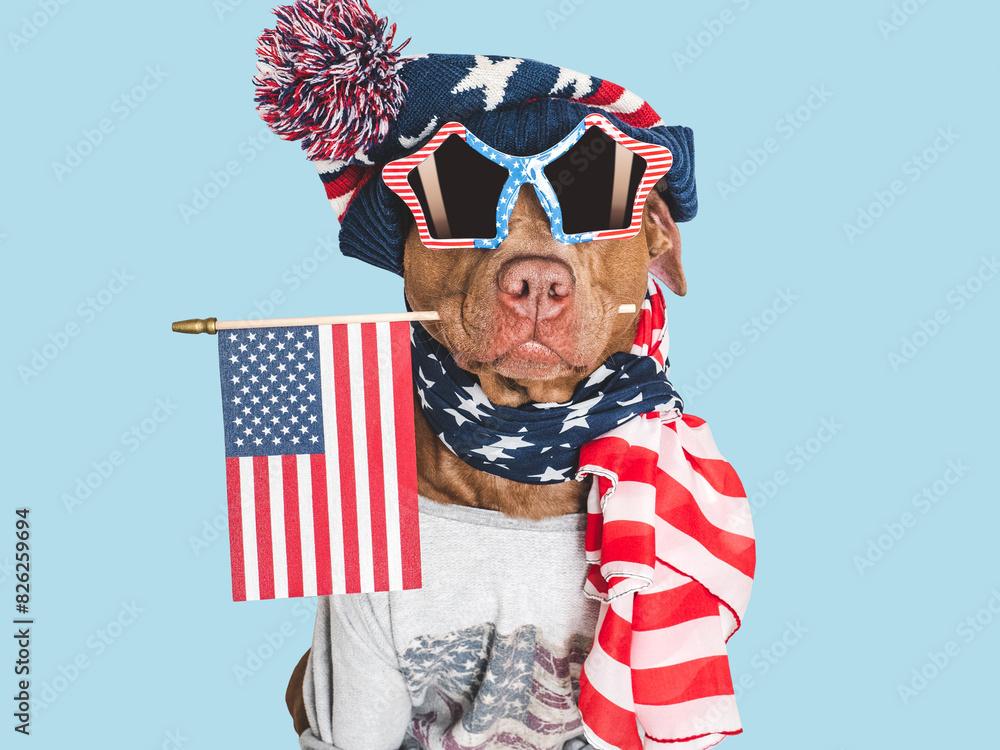 Cute dog, knitted winter hat and star-shaped sunglasses. Closeup, indoors. Studio shot. Congratulations for family, loved ones, relatives, friends and colleagues. Pets care concept