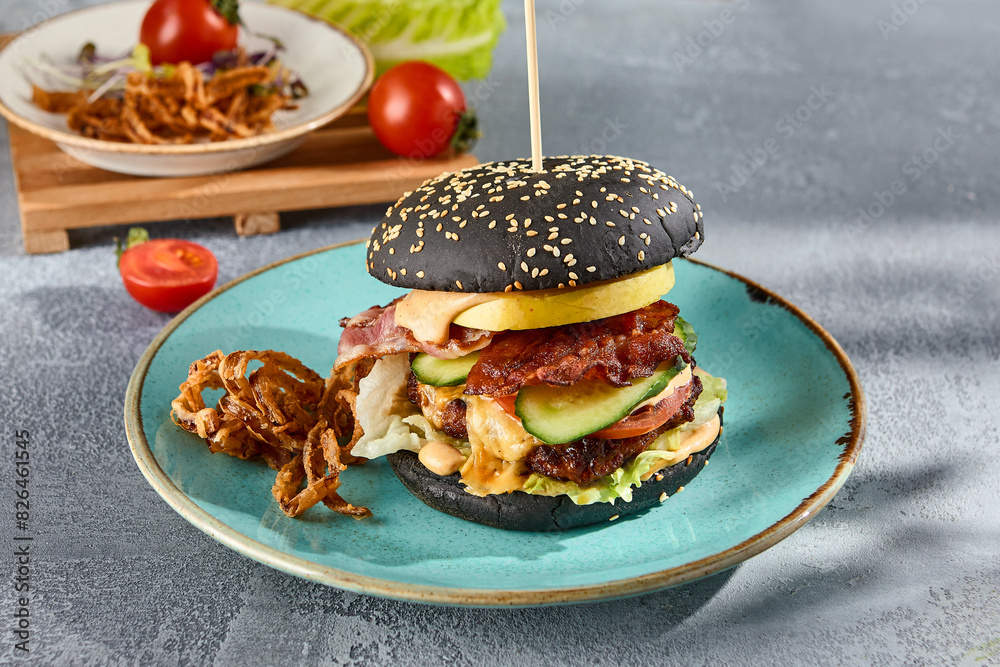 Gourmet black burger with bacon and crispy onions on a turquoise plate, gray textured backdrop with a hint of sunlight