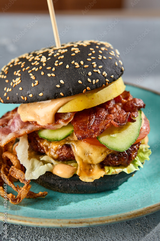 Gourmet black burger with bacon and crispy onions on a turquoise plate, gray textured backdrop with a hint of sunlight