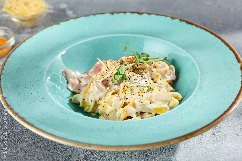 Classic Carbonara pasta with ham and cheese on a turquoise ceramic plate, garnished with herbs over a textured gray surface