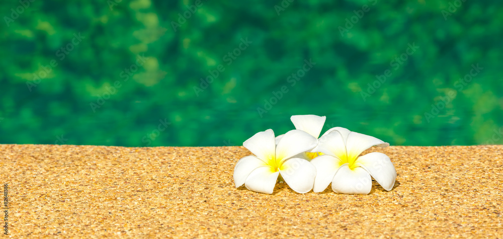 beautiful tropical Plumeria flowers on swimming pool with green