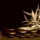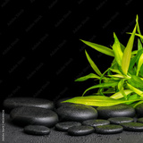 spa concept of twigs bamboo with dew on zen basalt stones, close