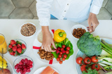 Female Nutritionist expert makes healthy balanced diet plate according to proportions of nutrients. Plate with pie chart of fruit, vegetables, grains, proteins on kitchen table with ingredients.