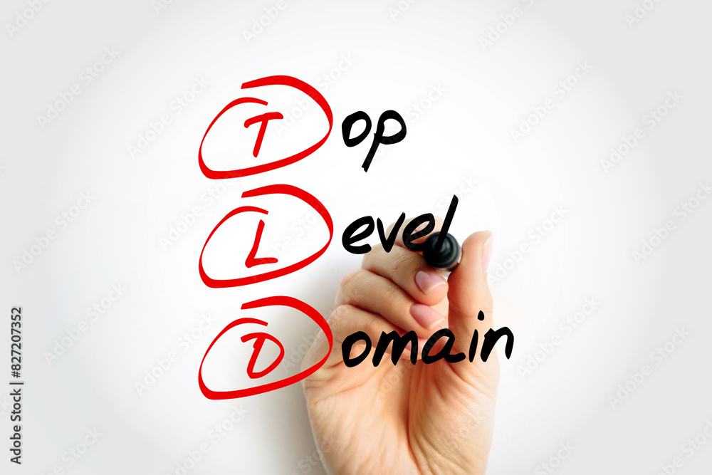 TLD - Top Level Domain is one of the domains at the highest level in the hierarchical Domain Name System of the Internet, acronym text concept with marker