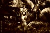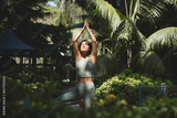 Fit sporty mindful young Hispanic woman meditating doing yoga breathing exercises with eyes closed feeling peace of mind, mental balance standing in green nature tropical park on sunny day.