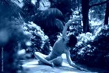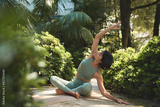 Happy mindful young Hispanic woman wearing green sportswear meditating doing yoga breathing exercises feeling peace of mind sitting in lotus pose stretching in nature park outdoors. Authentic shot.