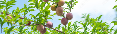 Panorama look up view ripe Chinese plum on tree branch with green foliage leaves under sunny cloud blue sky at home garden fruit orchard in Dallas, Texas, load of Asian plums ready to harvest