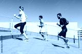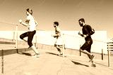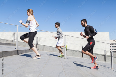 Three young friends running on the steps of a building