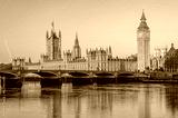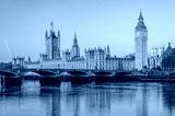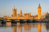 Early sunny morning with Palace of Westminster and Big Ben clock tower seen across River Thames, London, United Kingdom
