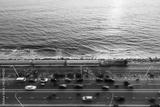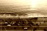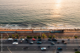 Road and railway track along coast at sunset over Indian ocean. Train arriving in Colombo, Sri Lanka..