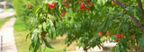 Panorama view residential street sidewalk and abundant of red ripe fruits on Nectarines tree branch at front yard garden of single-family home in Dallas, Texas, Foodscaping and Edible landscaping