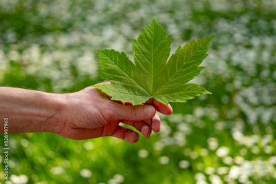 male hand holding green leaf wood, connection between nature and heart health, Cardiac care, Eco-friendly living