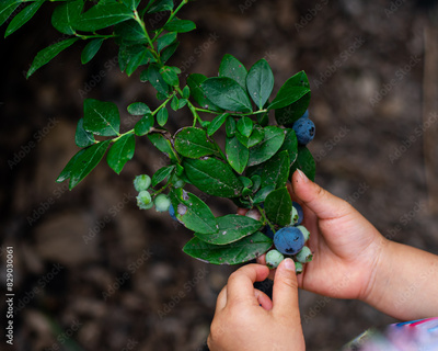 Toddler girl hands picking up fresh blueberry from backyard garden home fruit orchard in Dallas, Texas, top view baby little fingers harvesting homegrown ripe berries, organic edible landscape