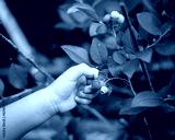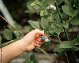 Toned photo toddler girl hands picking up fresh blueberry from backyard garden home fruit orchard, Dallas, Texas, top view baby little fingers harvesting homegrown ripe berries, edible landscape